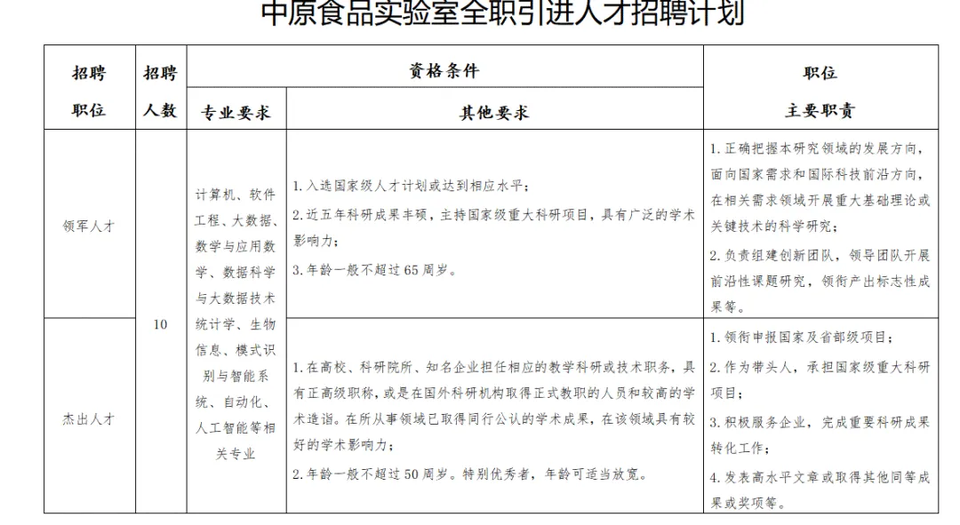 中原食品实验室拟面向社会公开招聘硕士研究生以上学历科研人员,数量10人(具体要求详见附件1)。
