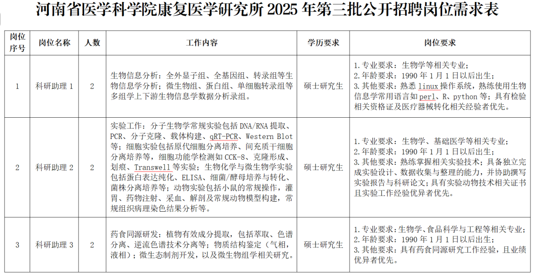 附件:1.河南省医学科学院康复医学研究所2025年第三批公开招聘岗位需求表.doc