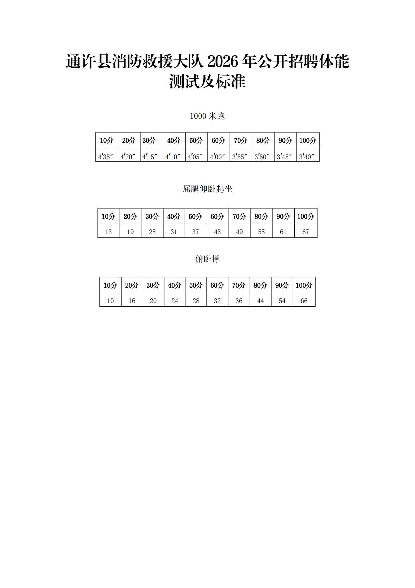 体能测试包含1000米跑、仰卧起坐、俯卧撑三个项目,测试成绩参照(附件3)《体能测试项目及标准》,根据体能测试成绩由高分到低分的顺序按照招聘人数1:3的比例进入面试。