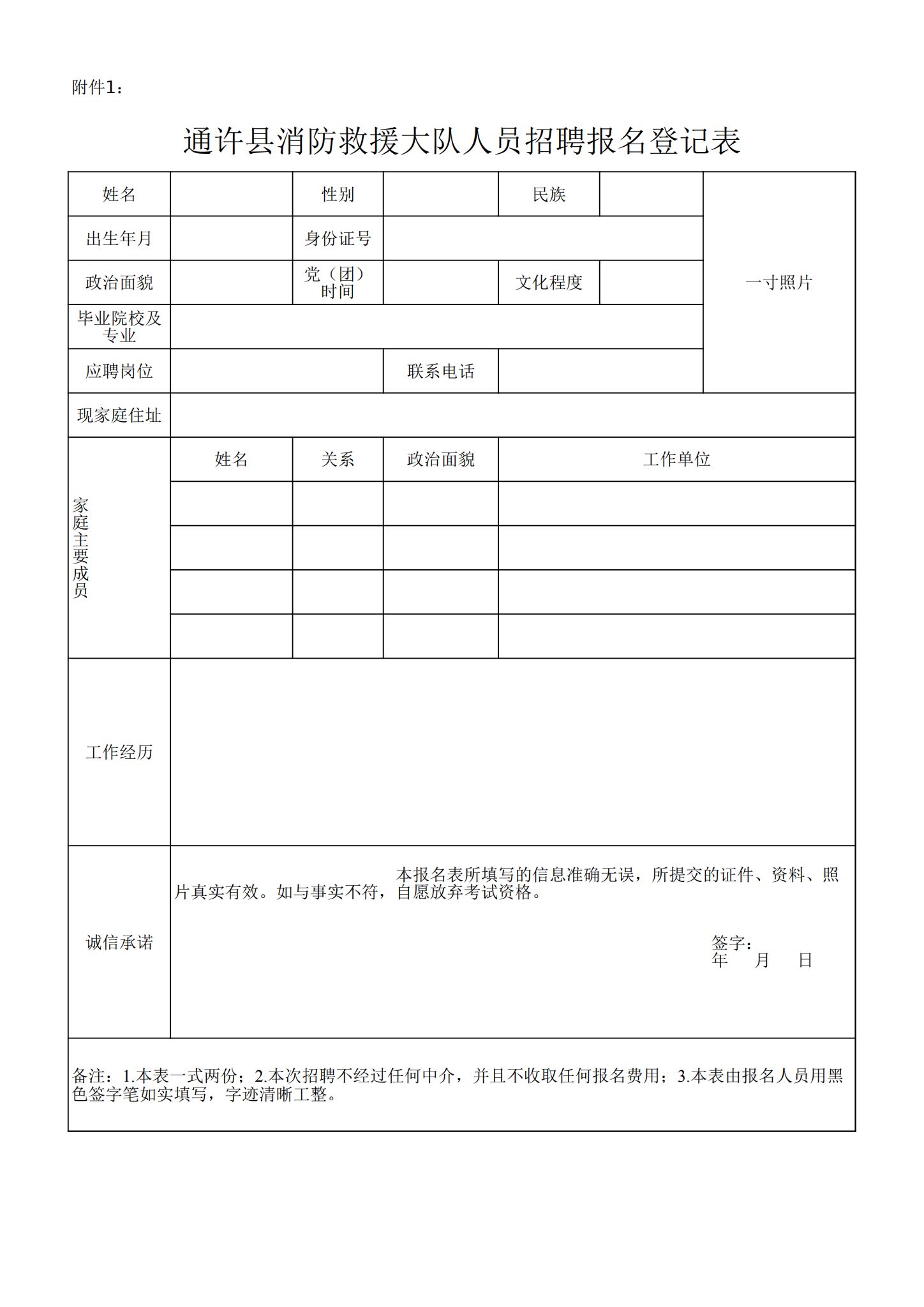 附件1:通许县消防救援大队人员招聘报名登记表