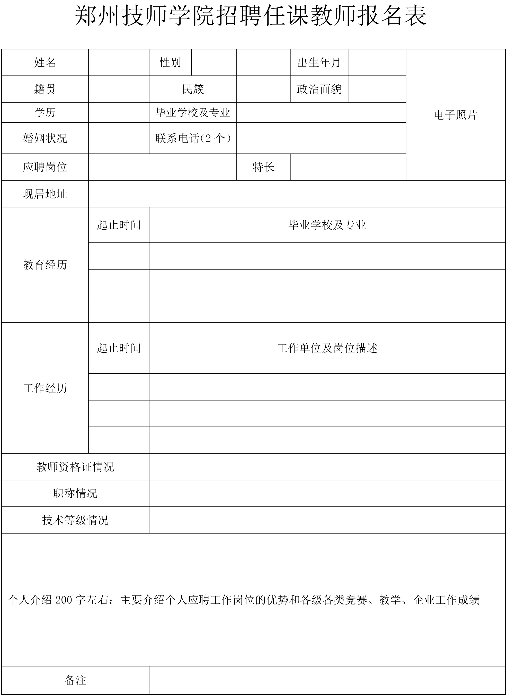 (二)报名方式:本次招聘采取网上报名方式,每人限报一个岗位。应聘人员需填写《郑州技师学院招聘报名登记表》(详见附件),文件名统一规范为“姓名+联系电话+应聘岗位”,发送至指定邮箱: