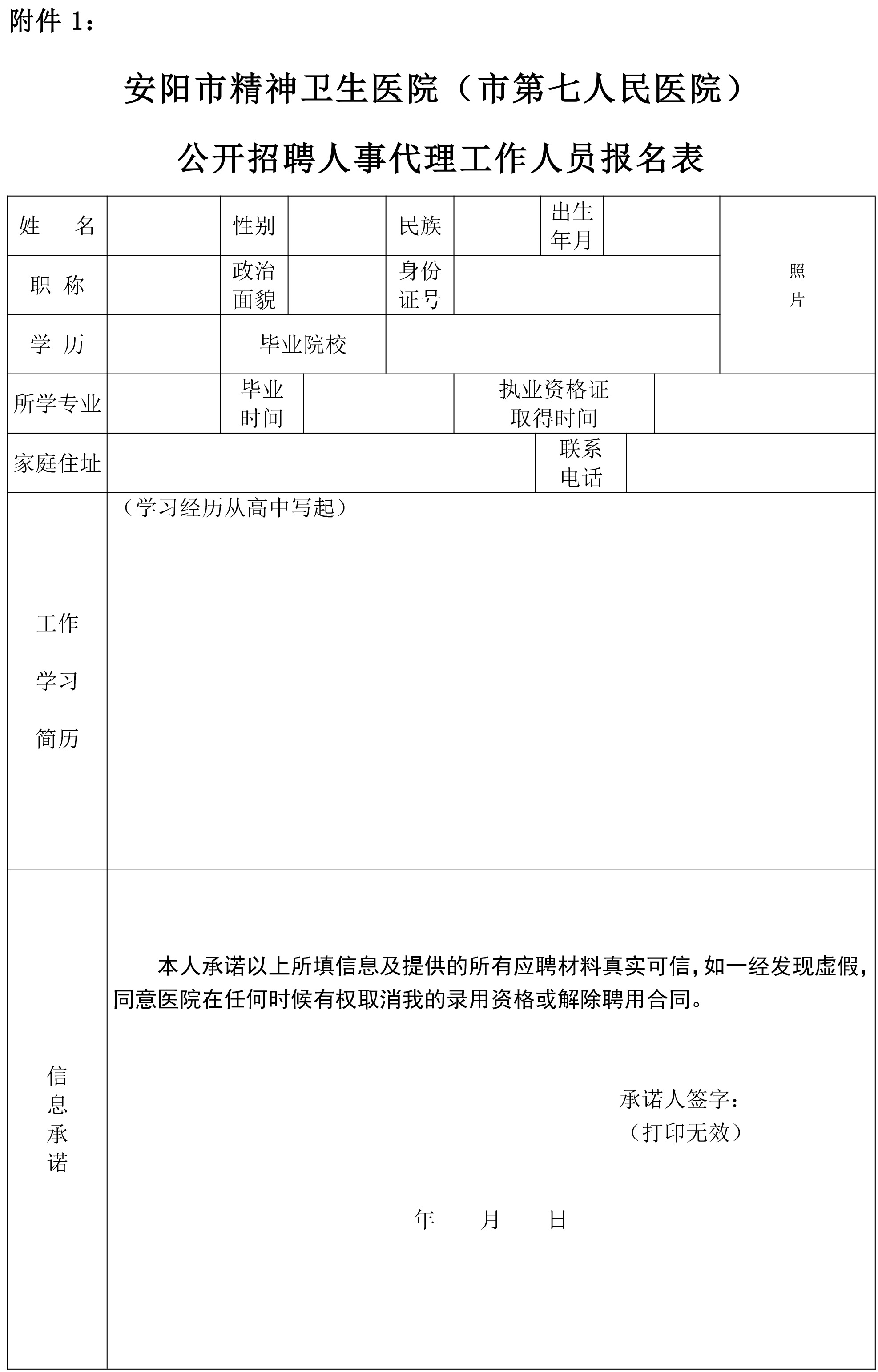 附件:安阳市精神卫生医院(市第七人民医院)公开招聘人事代理工作人员报名表